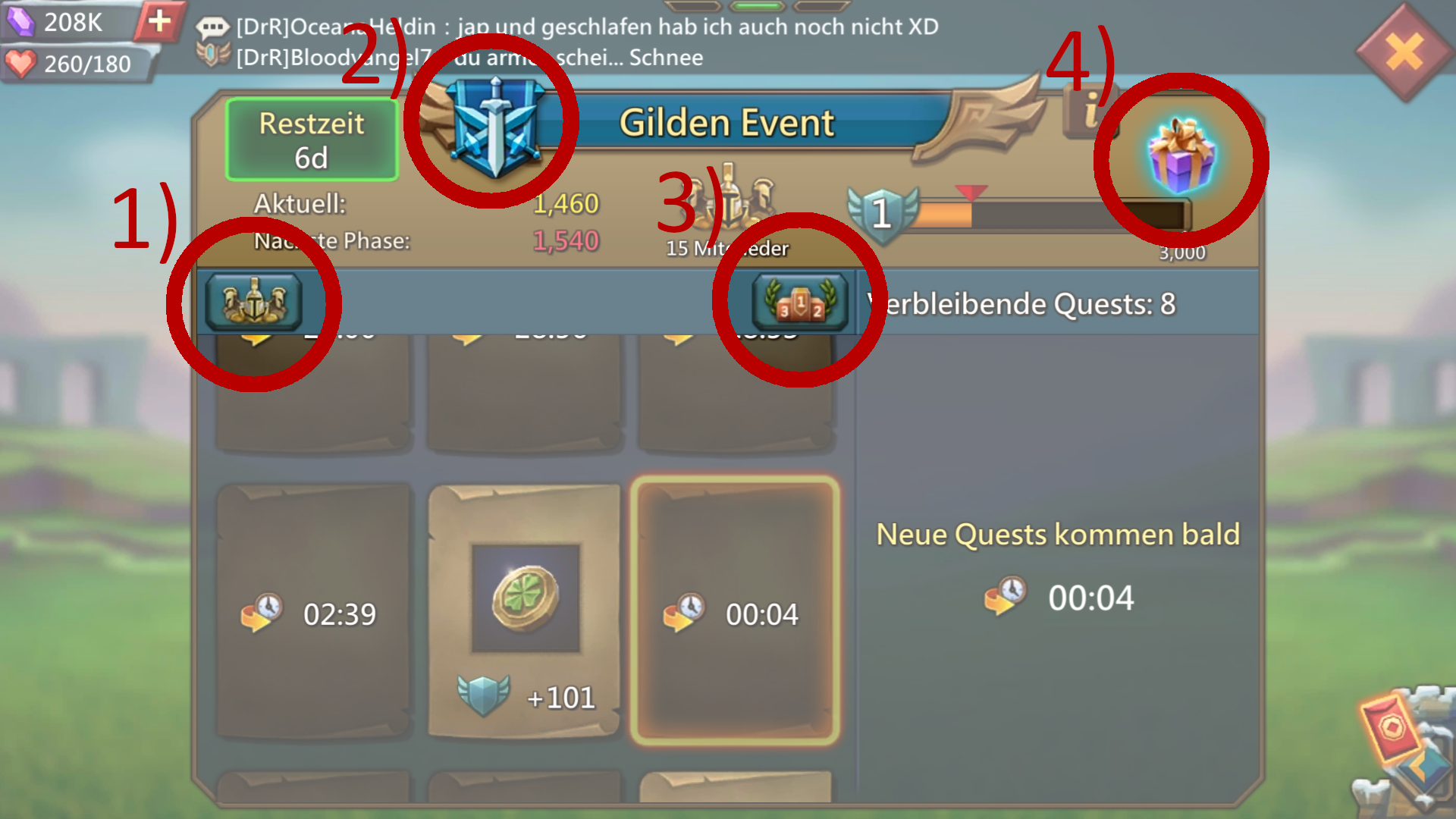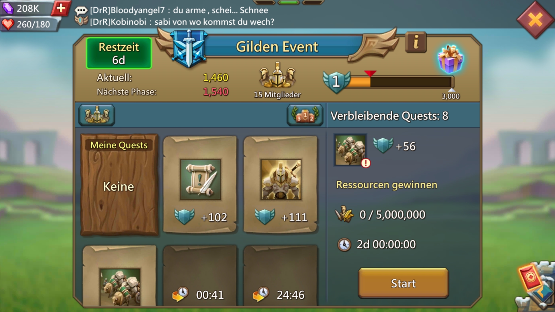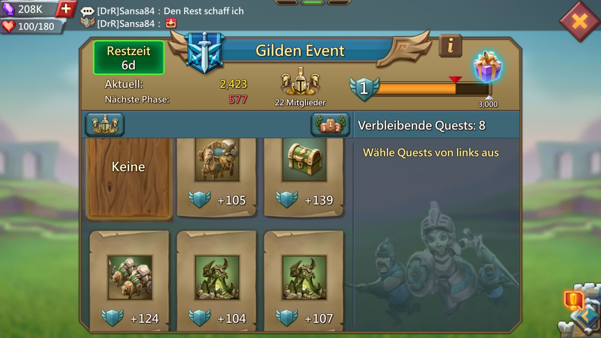 Darunter kommt 2 Level 5 Felder vollständig abräumen, je nach Königreich wird das mit oder ohne Probleme möglich sein. Daneben 4 xNester als Kapitän gewinnen, vielleicht sollte man dafür die Halle schon etwas ausgebaut haben, ansonsten kein Problem. Während rechts außen ein Nest ist, wo man 2 Essenzen mit mindestens Level 19 erhalten muss. Ich bevorzuge da die Aufgaben mit 4 Essenzen für 154 Punkte oder besser noch 6 Essenzen für 201 Punkte. Dabei ist immer im Vorfeld abzuklären, ob entsprechend starke Spieler in der Gilde sind, und wann dafür Zeit ist.