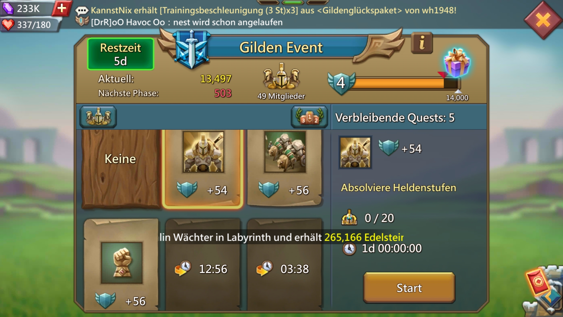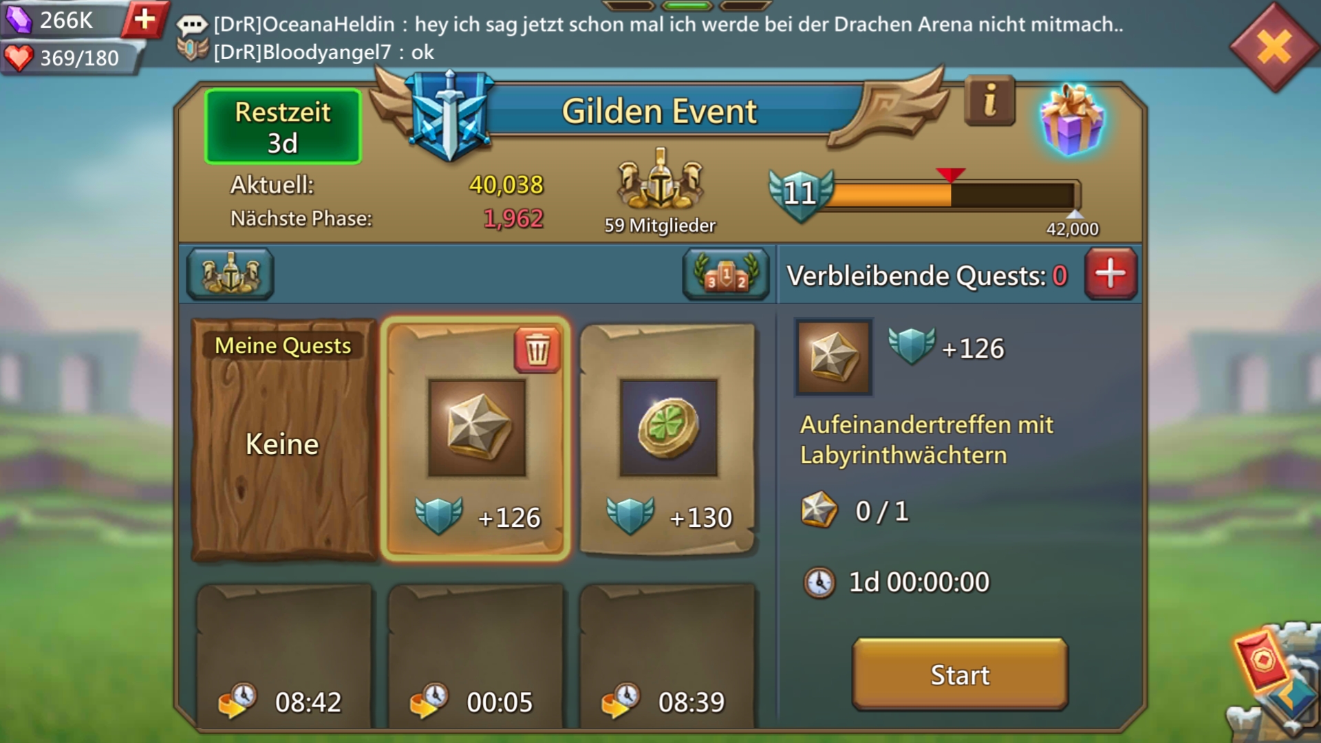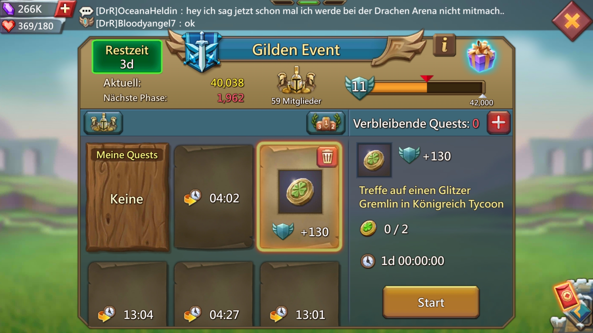 Darunter kommt 2 Level 5 Felder vollständig abräumen, je nach Königreich wird das mit oder ohne Probleme möglich sein. Daneben 4 xNester als Kapitän gewinnen, vielleicht sollte man dafür die Halle schon etwas ausgebaut haben, ansonsten kein Problem. Während rechts außen ein Nest ist, wo man 2 Essenzen mit mindestens Level 19 erhalten muss. Ich bevorzuge da die Aufgaben mit 4 Essenzen für 154 Punkte oder besser noch 6 Essenzen für 201 Punkte. Dabei ist immer im Vorfeld abzuklären, ob entsprechend starke Spieler in der Gilde sind, und wann dafür Zeit ist.