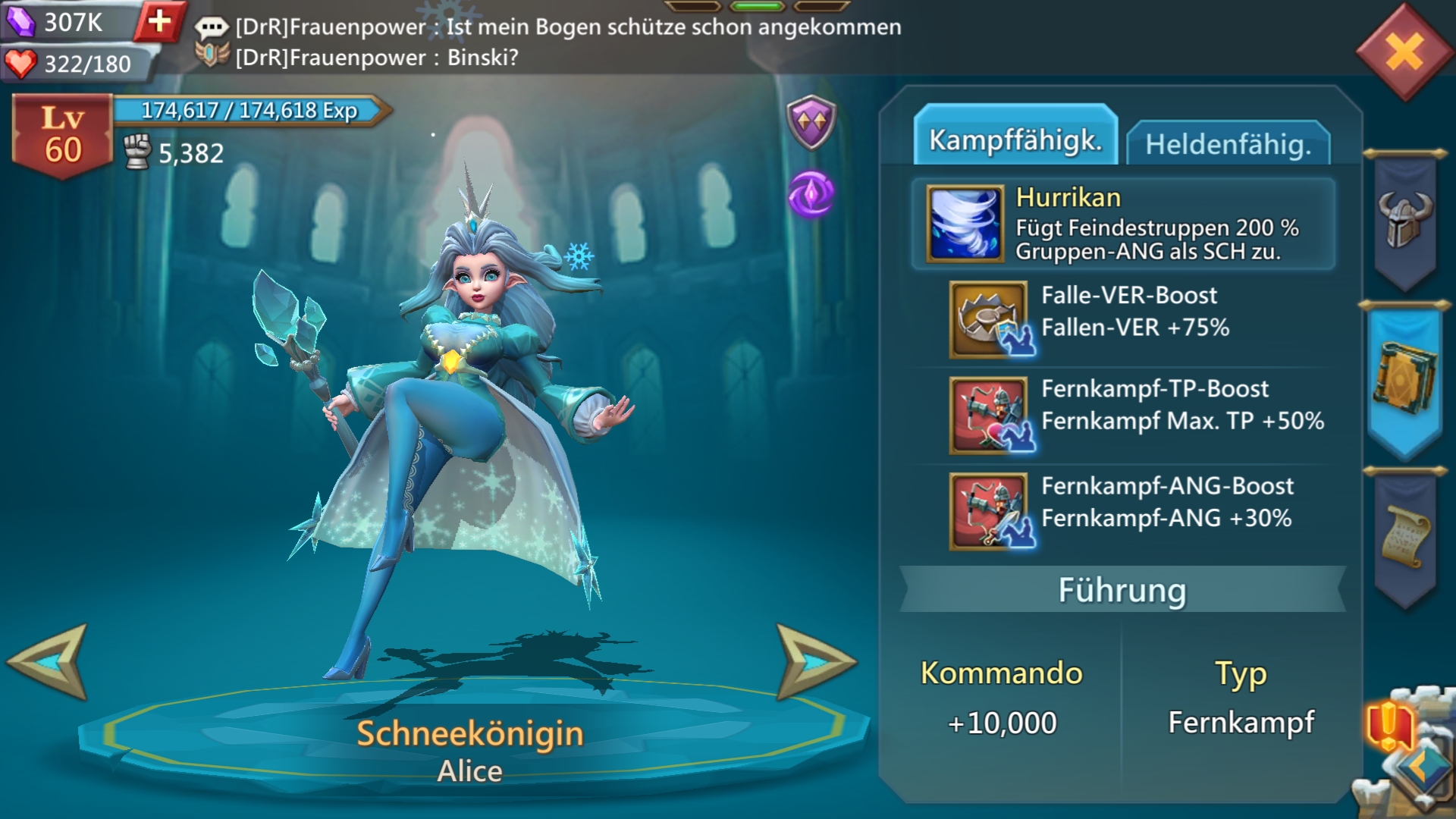 Davon ist der Sturmweiser (Anderson) nicht als führender Held zu gebrauchen, auch der Seeknappe (Lochflosse) wäre nicht die beste Wahl. Die Schneekönigen (Alice) hingegen bringt da auf gold Fernkampf Max TP +50% und Fernkampf Angriff +30% mit. Also das was der Eidträger für Infanterie hat. Für Kavallrie hat dann für Armee die vergleichbaren Werte Kind des Lichts (Sparky).